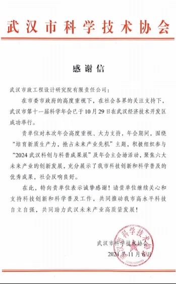 ? ? 在年會(huì)上,武漢市政院展示了近年來在科技創(chuàng)新和科學(xué)普及方面取得的成果,贏得了武漢市科協(xié)的高度贊譽(yù),特此發(fā)來感謝信,對(duì)雙方在科技領(lǐng)域的攜手合作予以充分肯定,并期待未來繼續(xù)并肩前行,共同書寫科技進(jìn)步與城市發(fā)展的新篇章。