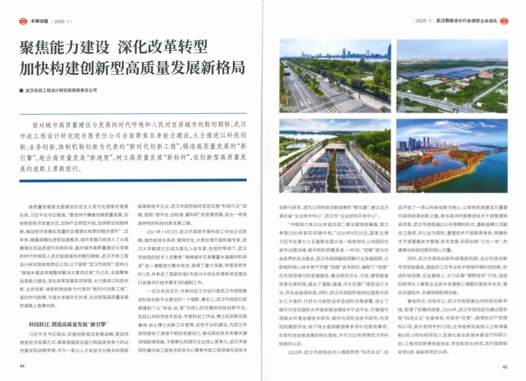 ? ? 近日,行業(yè)權(quán)威期刊《中國勘察設(shè)計》聚焦武漢勘察設(shè)計行業(yè),對領(lǐng)軍企業(yè)進行了專題報道。其中,武漢市政工程設(shè)計研究院有限責(zé)任公司(以下簡稱“武漢市政院”)以“聚焦能力建設(shè),深化改革轉(zhuǎn)型,加快構(gòu)建創(chuàng)新型高質(zhì)量發(fā)展新格局”為主題,分享了其在新時代背景下的創(chuàng)新實踐和發(fā)展成果,展示了企業(yè)在高質(zhì)量發(fā)展道路上勇毅前行的風(fēng)采和活力,引發(fā)了行業(yè)廣泛關(guān)注。