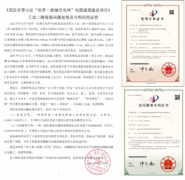 發(fā)明專利“一種深厚軟土深基坑軟弱土體預(yù)加固方法”(專利號:ZL202111022273.2)與實用新型專利“一種一級階地鄰近建構(gòu)筑物基坑支護(hù)及地下水控制結(jié)構(gòu)”(專利號:ZL202220309776.1),在武漢市青山區(qū)“世界一流城市電網(wǎng)”電纜通道建設(shè)項目——工業(yè)二路現(xiàn)場問題處理中實現(xiàn)了高效應(yīng)用。兩項專利的技術(shù)性能、實施效果及產(chǎn)品質(zhì)量均達(dá)到預(yù)期目標(biāo),成功完成了技術(shù)轉(zhuǎn)化,展現(xiàn)出良好的經(jīng)濟(jì)效益與環(huán)境效益。