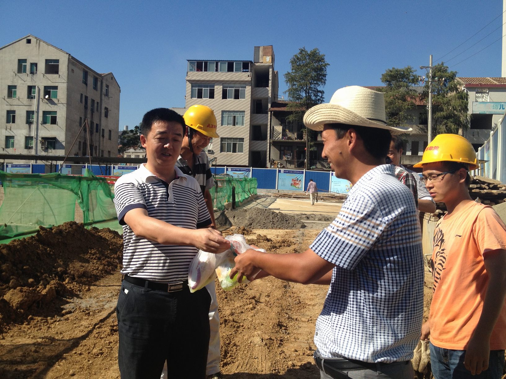 ??? 近段時間,武漢市出現(xiàn)了連續(xù)高溫天氣,但為了保障所承擔項目的按時推進,公司監(jiān)理、勘測、測試等外業(yè)人員仍然在烈日下堅守工作崗位。8月16日,公司黨委書記蔡輝、副總經(jīng)理趙世杰、總經(jīng)理助理胡軍等一行在監(jiān)理公司、勘測設計院負責人的陪同下,對部分工地進行了走訪慰問,為高溫下堅持工作的員工送上一份清涼。