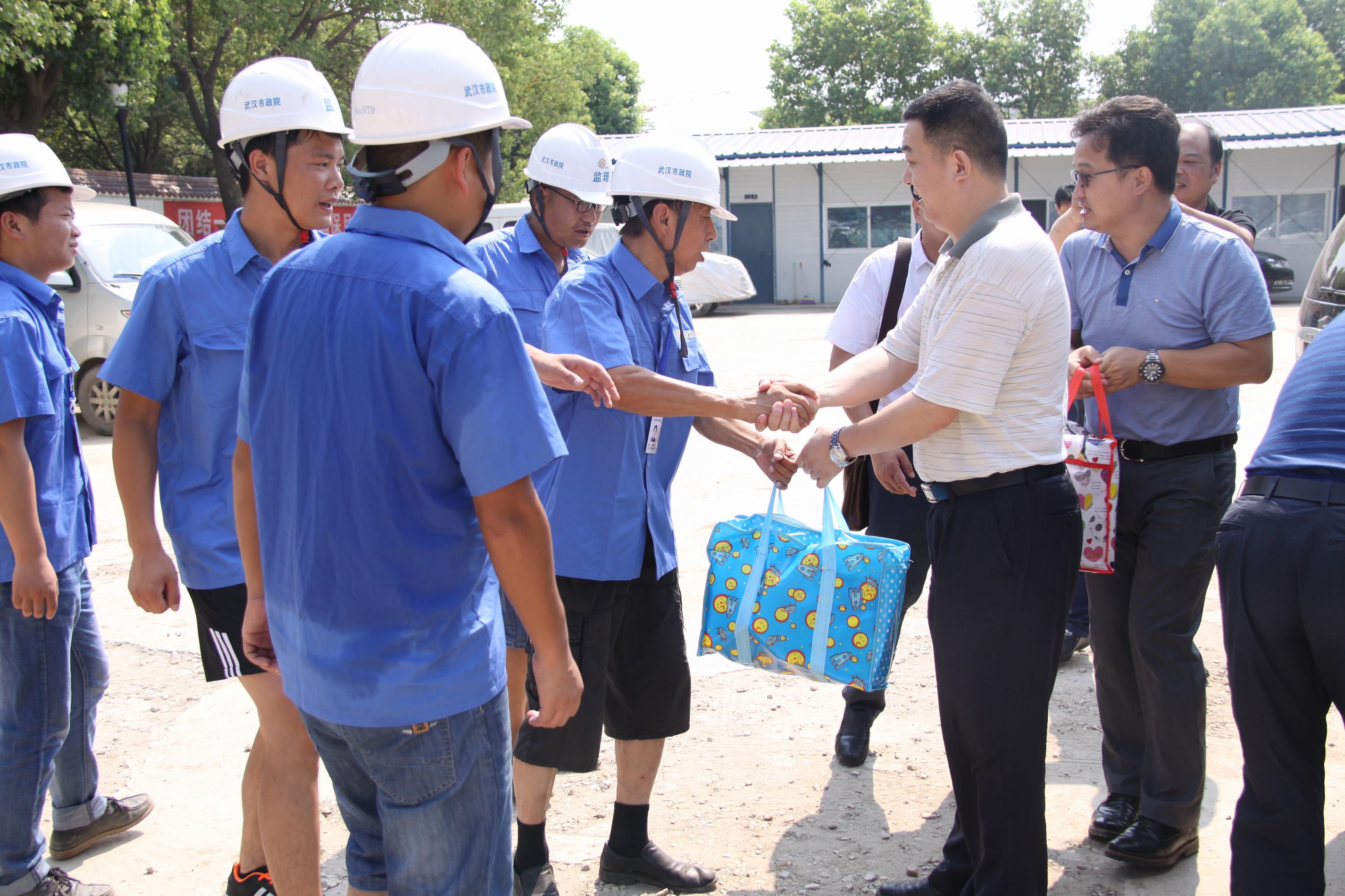??? 蔡輝書記一行先后來(lái)到城華路、漢陽(yáng)海綿城市示范區(qū)、黃家湖污水處理廠等工地現(xiàn)場(chǎng),為堅(jiān)守在現(xiàn)場(chǎng)的員工們送上消暑慰問(wèn)品。公司領(lǐng)導(dǎo)聽(tīng)取了現(xiàn)場(chǎng)負(fù)責(zé)人的工作情況匯報(bào),詳細(xì)詢問(wèn)了員工們的工作和生活情況,并叮囑他們注意高溫天氣下的工作安全。同時(shí)要求相關(guān)部門負(fù)責(zé)人合理安排工作時(shí)間,做好人員調(diào)配,制定防暑降溫工作預(yù)案,保證一線員工的身體健康。