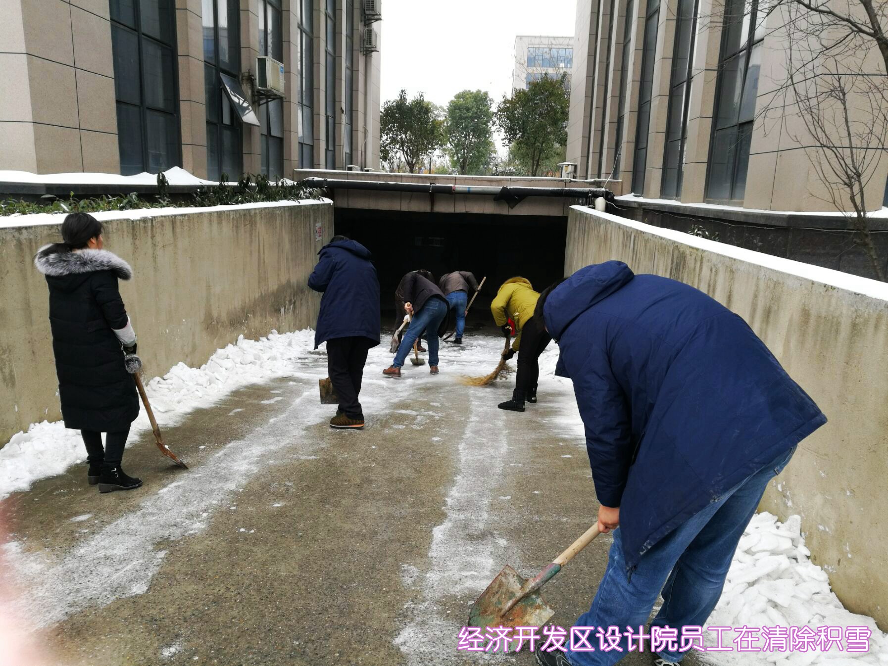 ??? 1月28日,武漢市政院的全體員工響應(yīng)市政府緊急通知的要求,放棄了周末休息時(shí)間,一大早便紛紛趕到公司,投入到抗擊冰雪保暢通的行動(dòng)中。由于連日來(lái)江城氣溫較低,雪落到路面上已經(jīng)形成了厚厚的冰層,為員工們鏟除冰雪帶來(lái)了極大的難度。在公司領(lǐng)導(dǎo)的帶領(lǐng)下,大家有的拿起鐵鍬鏟除冰層,有的拿著鋤鎬,敲碎路面上的堅(jiān)冰,有的則拿起掃帚,掃凈路面的冰雪殘?jiān)?。所謂人多力量大,不多時(shí),公司周邊道路及人行道上的冰雪便被鏟除干凈。