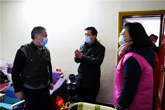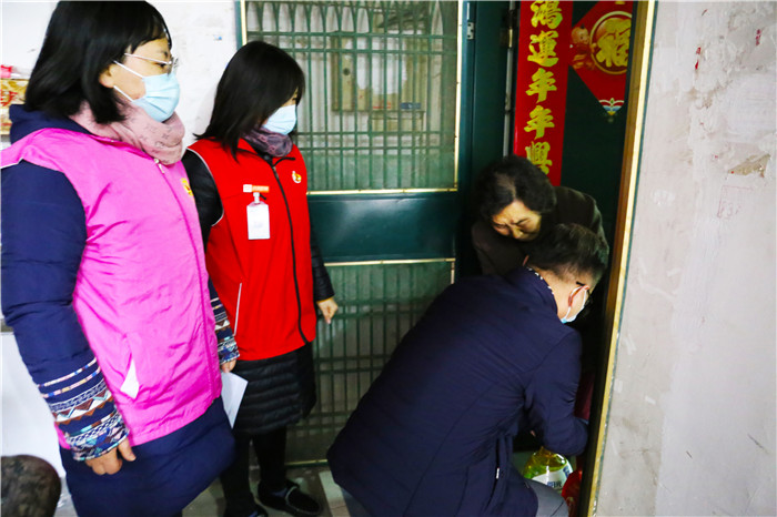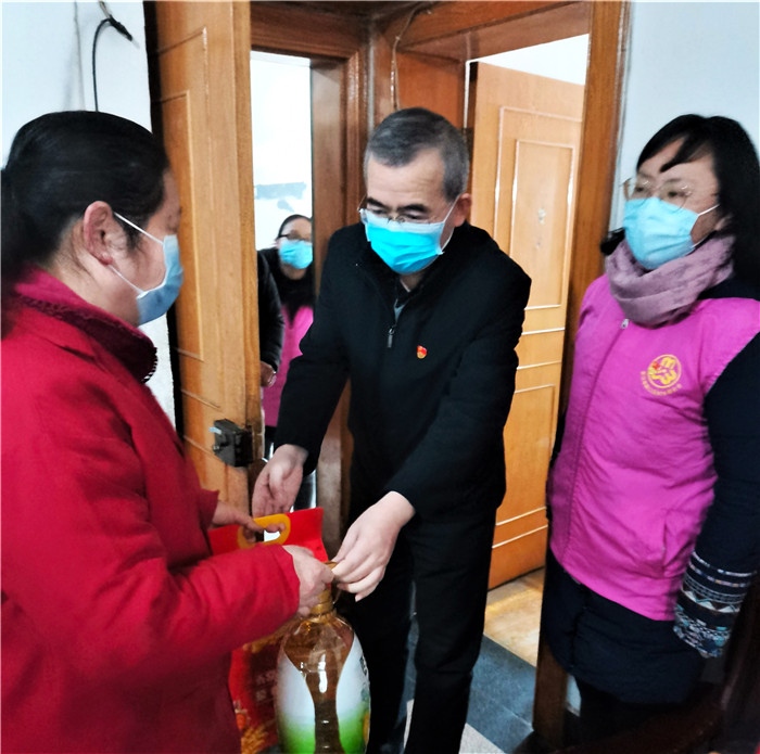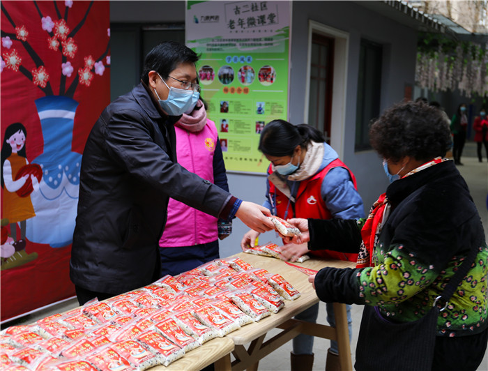 慰問期間,恰逢社區(qū)正在開展“臘八送福·甜蜜相伴”活動(dòng),談逢陽一行也加入其中,熱情地為前來的社區(qū)居民發(fā)放臘八米,送上殷切的節(jié)日祝福,叮囑他們要做好防護(hù)。